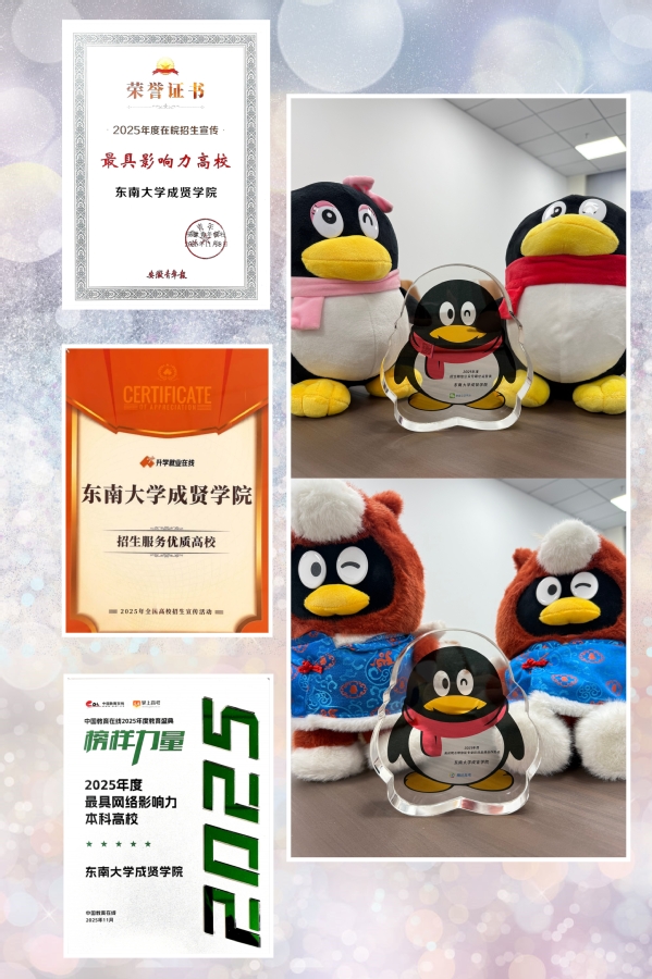 近日,东南大学成贤学院在2025年度招生宣传工作中表现卓越,接连荣获五项荣誉,充分展现了学校在招生宣传、网络影响力及新媒体运营方面的综合实力与赢得了广泛认可。