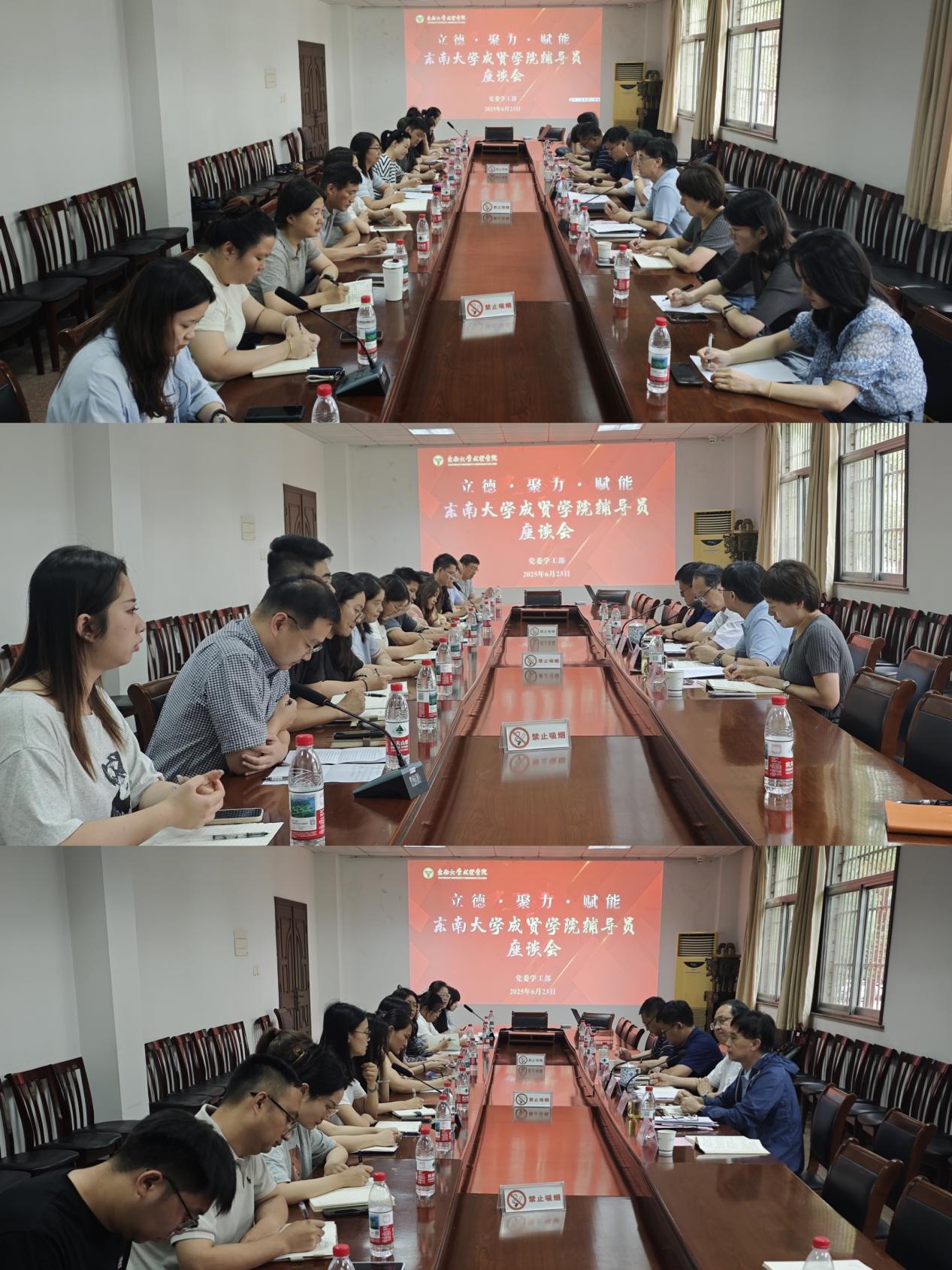 6月23日,我校在真知馆105会议室举办“立德·聚力·赋能”辅导员座谈会。校党委书记张志胜、组织人事部部长汪旭东、团委书记潘明烽、学生处副处长沈黎芳和全体辅导员参加此次座谈会。会议由党委学工部部长、学生处处长施杰主持。